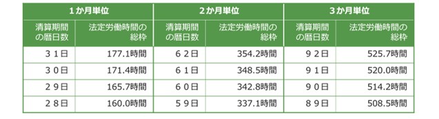 例えば、月単位の清算期間とした場合の法定労働時間の総枠は、以下の法定労働時間の総枠の範囲内で総労働時間を定めなければなりません。