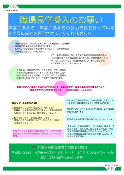 対象:兵庫県内の事業所、兵庫県内の就労支援機関で支援を受けている県内在住の障害をお持ちの方、又は県内の特別支援学校で就労を目指す県内在住の障害をお持ちの方
