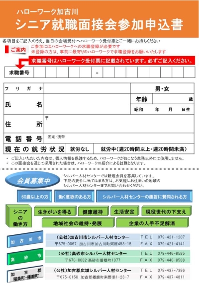 ハローワーク加古川「シニア就職面接会」のご案内です。