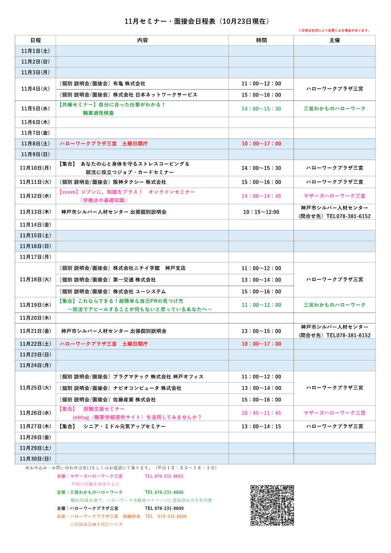 11月セミナー・面接会 日程表