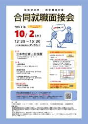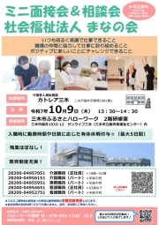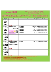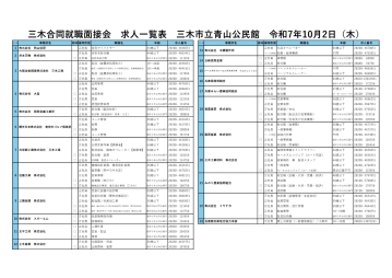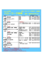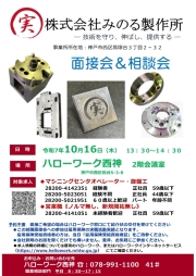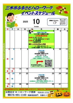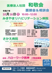 (10月 2日開催)三木市 合同就職面接会 13:30-15:30 (10月 9日開催)ミニ就職面接会&相談会(三木市ふるさとハローワーク) 「社会福祉法人まなの会 介護老人福祉施設 カトレア三木」 (10月16日 10:00-12:00開催)面接会&相談会「医療法人社団和敬会 みきやまリハビリテーション病院/さかえ病院」 (10月16日 13:30-14:30開催)面接会&相談会「株式会社みのる製作所」 (10月28日開催)看護補助者のお仕事セミナー