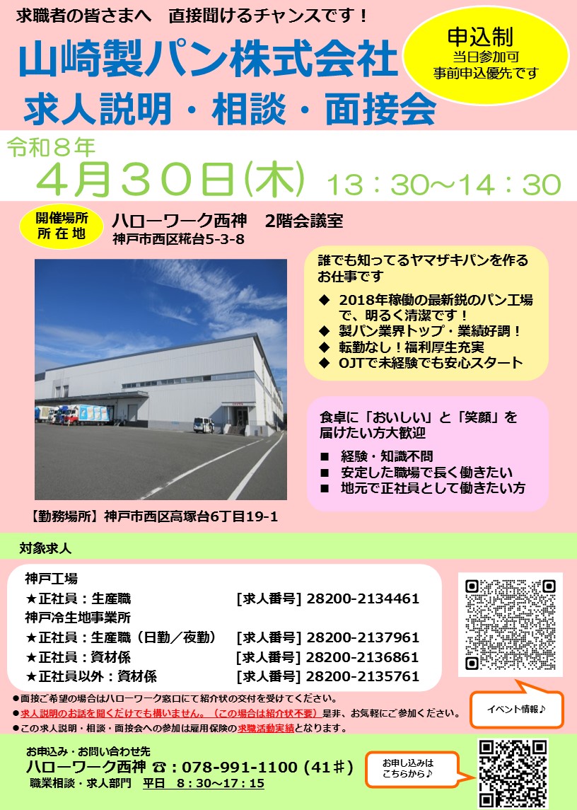 ( 4月23日開催)求人説明・相談・面接会「日本包装システム 株式会社」 ( 4月30日開催)求人説明・相談・面接会「山崎製パン株式会社 神戸工場/神戸冷生地事業所」