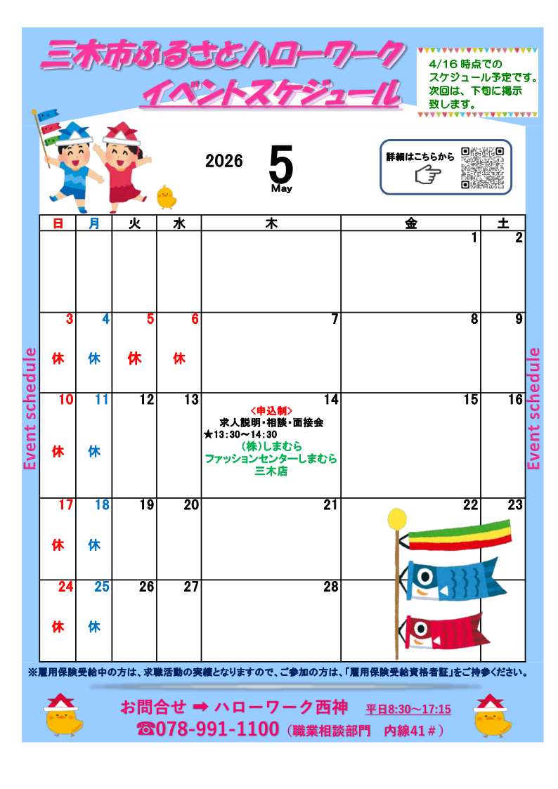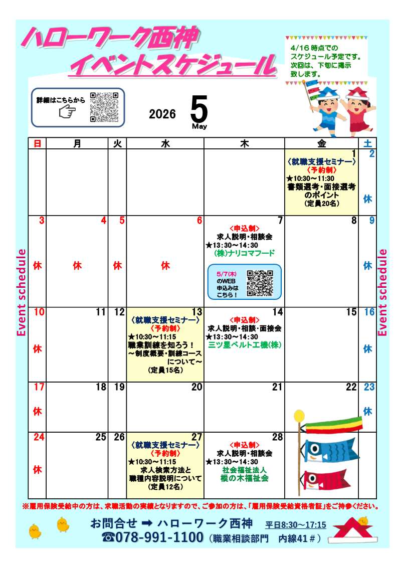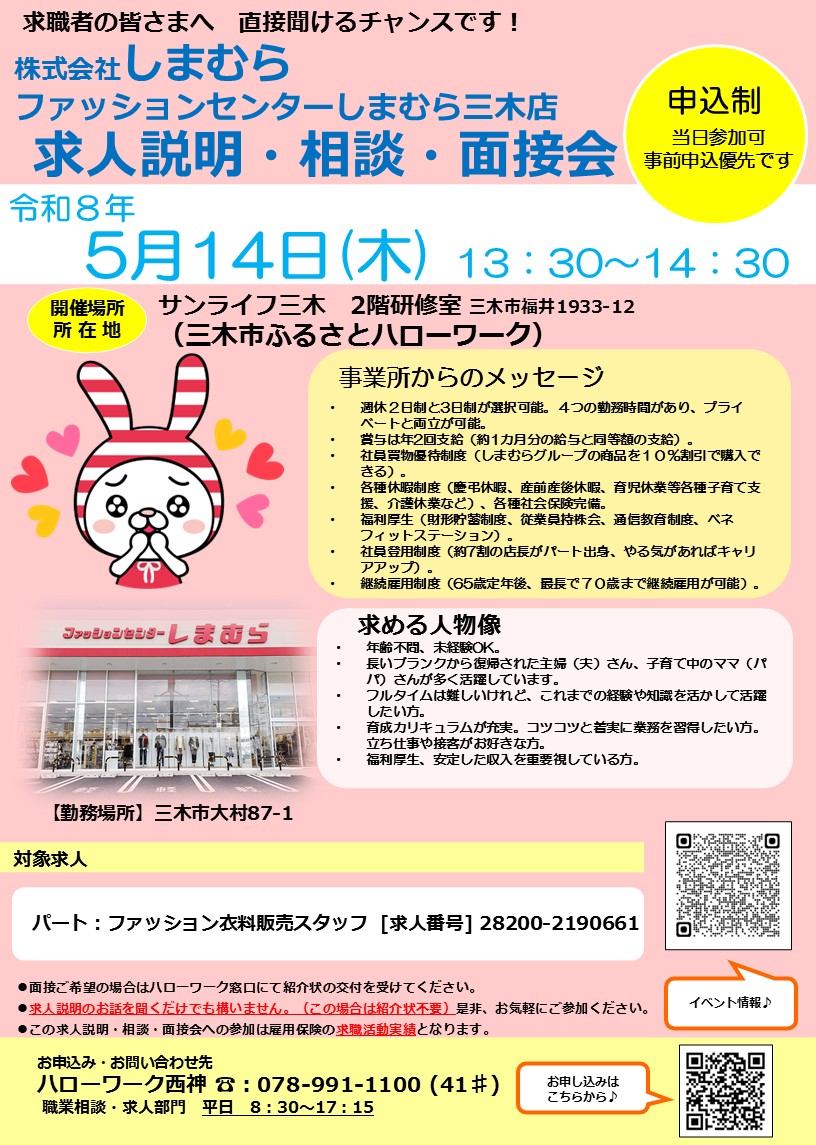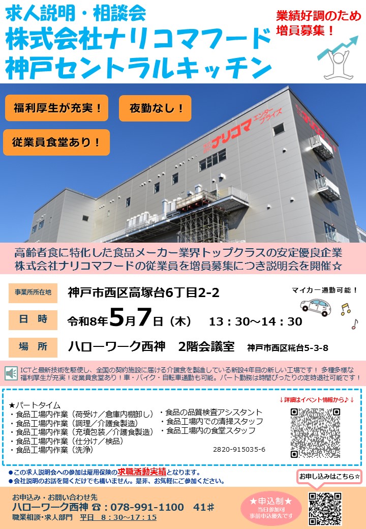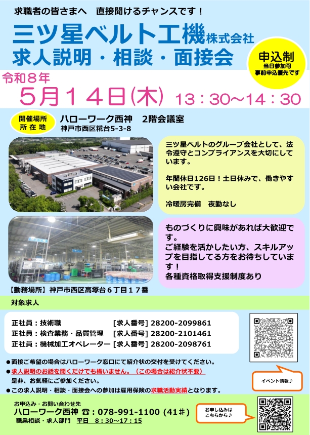 ( 5月 7日開催)求人説明・相談会「株式会社ナリコマフード 神戸セントラルキッチン」 ( 5月14日開催)求人説明・相談・面接会「三ツ星ベルト工機株式会社」 ( 5月14日開催)求人説明・相談・面接会「株式会社しまむら ファッションセンターしまむら三木店」