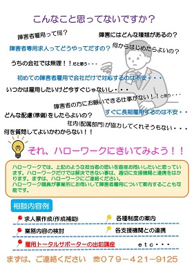 専門援助コーナーは、障害や難病の診断を受けている方への仕事探しの相談、紹介や会社・事業所の方の障害者雇用に係る求人受付や相談を行う窓口です。ハローワーク加古川専門援助コーナーでは、障害者雇用お考えの事業主の方を支援します。支援メニューもありますので、ぜひご活用ください。