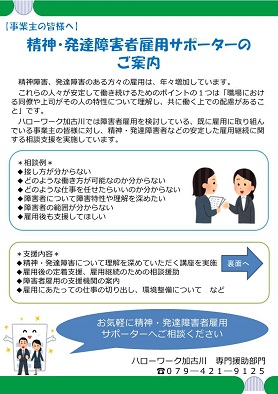 ハローワーク加古川では障害者雇用を検討している、既に雇用に取り組んでいる事業主の皆様に対し、精神・発達障害者しごとサポーター養成講座を実施しています。