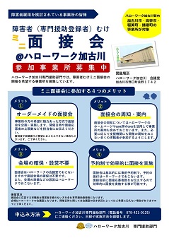 ハローワーク加古川では、会社・事業所からの申し出によりミニ面接会を随時実施しています。