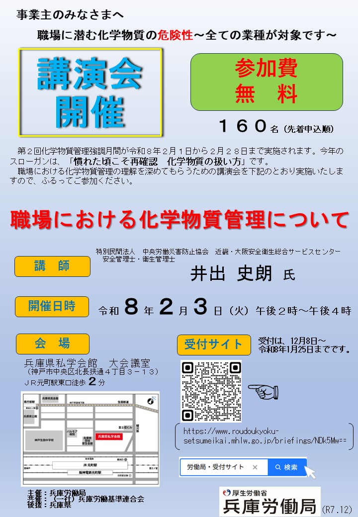 兵庫労働局、一般社団法人兵庫労働基準連合は、上記月間の一環として、講演会「職場に潜む化学物質の危険性 ~全ての業種が対象です~」を以下のとおり開催することといたしましたので、是非、ご参加ください。