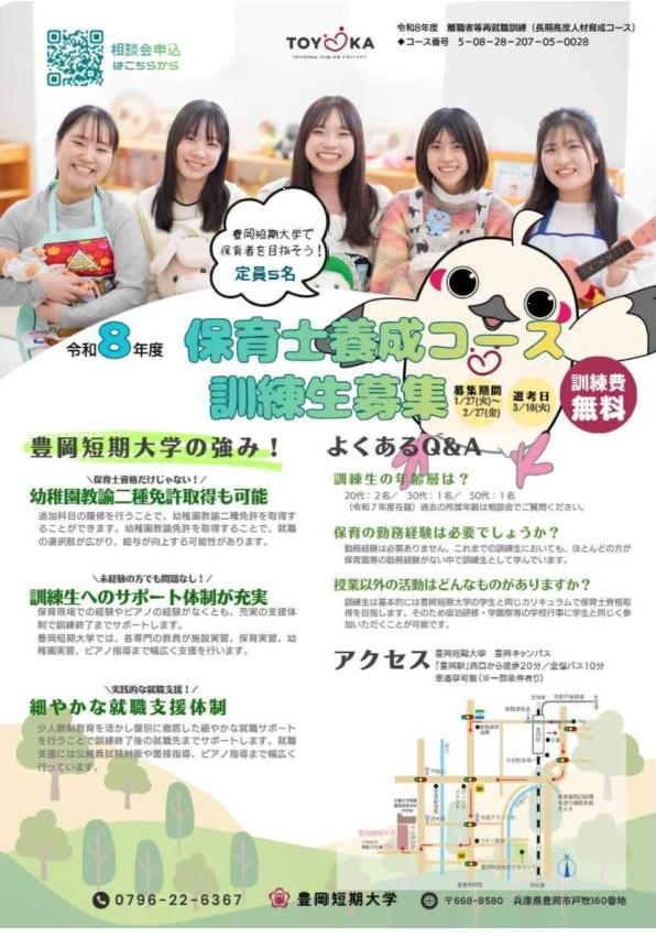 ◇ 募集期間:令和8年1月27日~2月27日 ◇ 選 考 日:令和8年3月10日 ◇ 訓練期間:令和8年4月1日~令和10年3月31日 ◇ 訓練実施機関:豊岡短期大学豊岡キャンパス ◇ 訓練費用:無料(テキスト代・実習着・教材費等は自己負担)