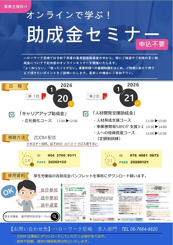 - (1月20日・21日開催)ハローワーク尼崎「オンラインで学ぶ!助成金セミナー」について