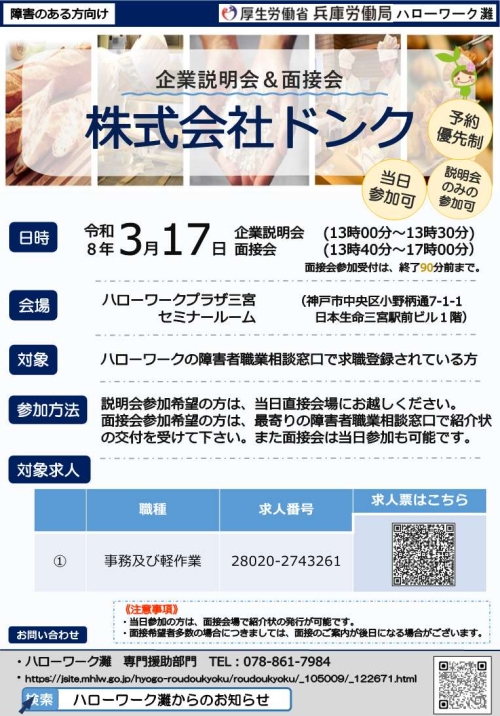 - (令和8年3月17日開催)ハローワーク灘「障害者求人 株式会社ドンク 企業説明会&面接会」について