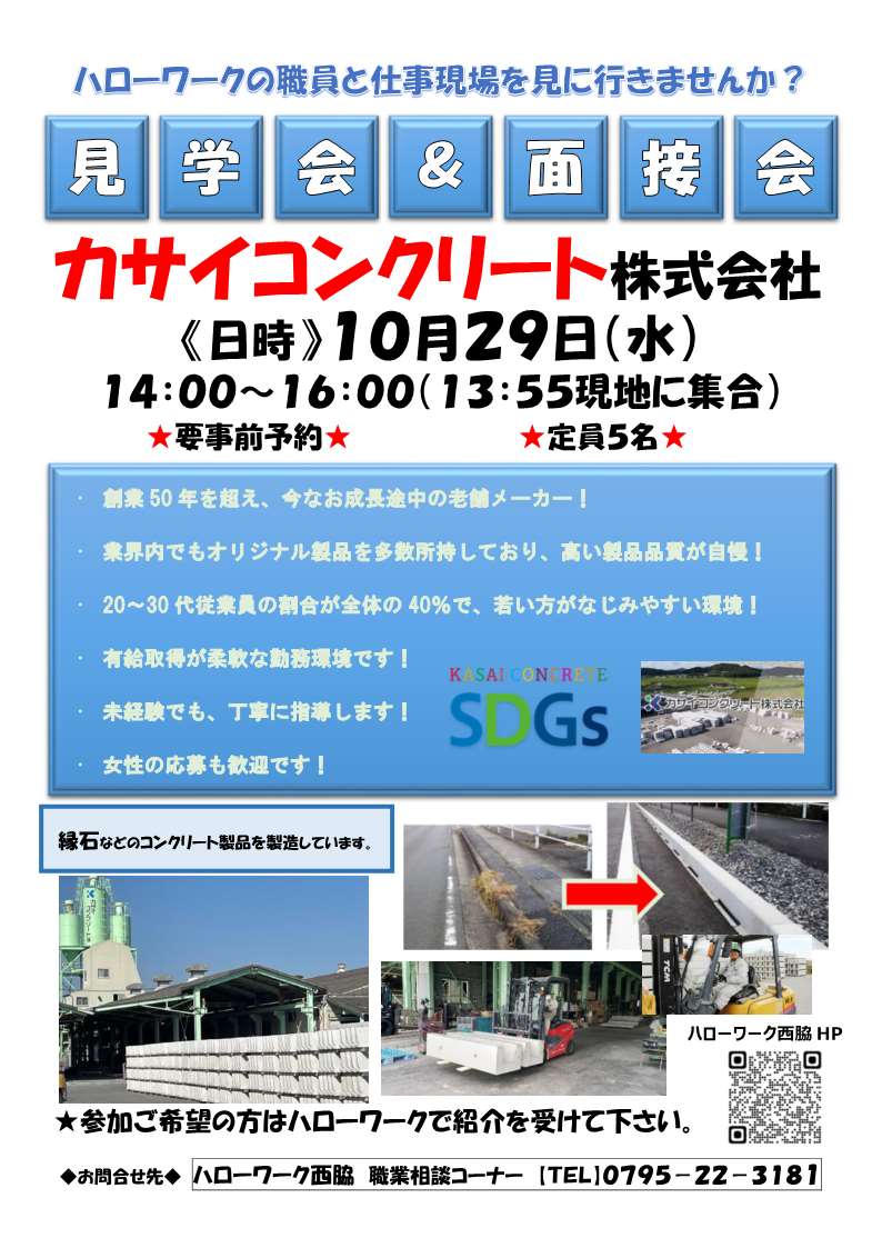 10月29日(水)「カサイコンクリート株式会社 見学会&面接会」
