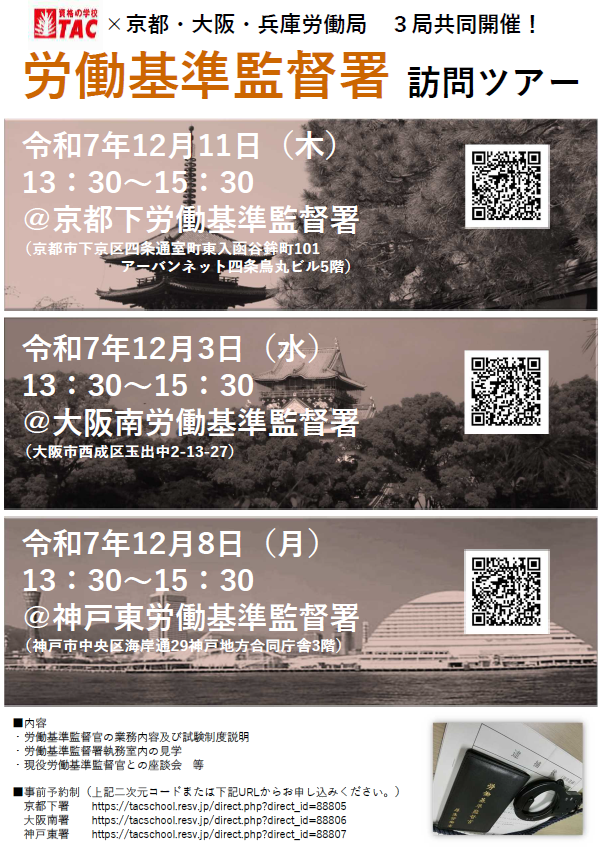 兵庫労働局では、資格の学校TACとの共催により、労働基準監督署訪問ツアーを開催します。