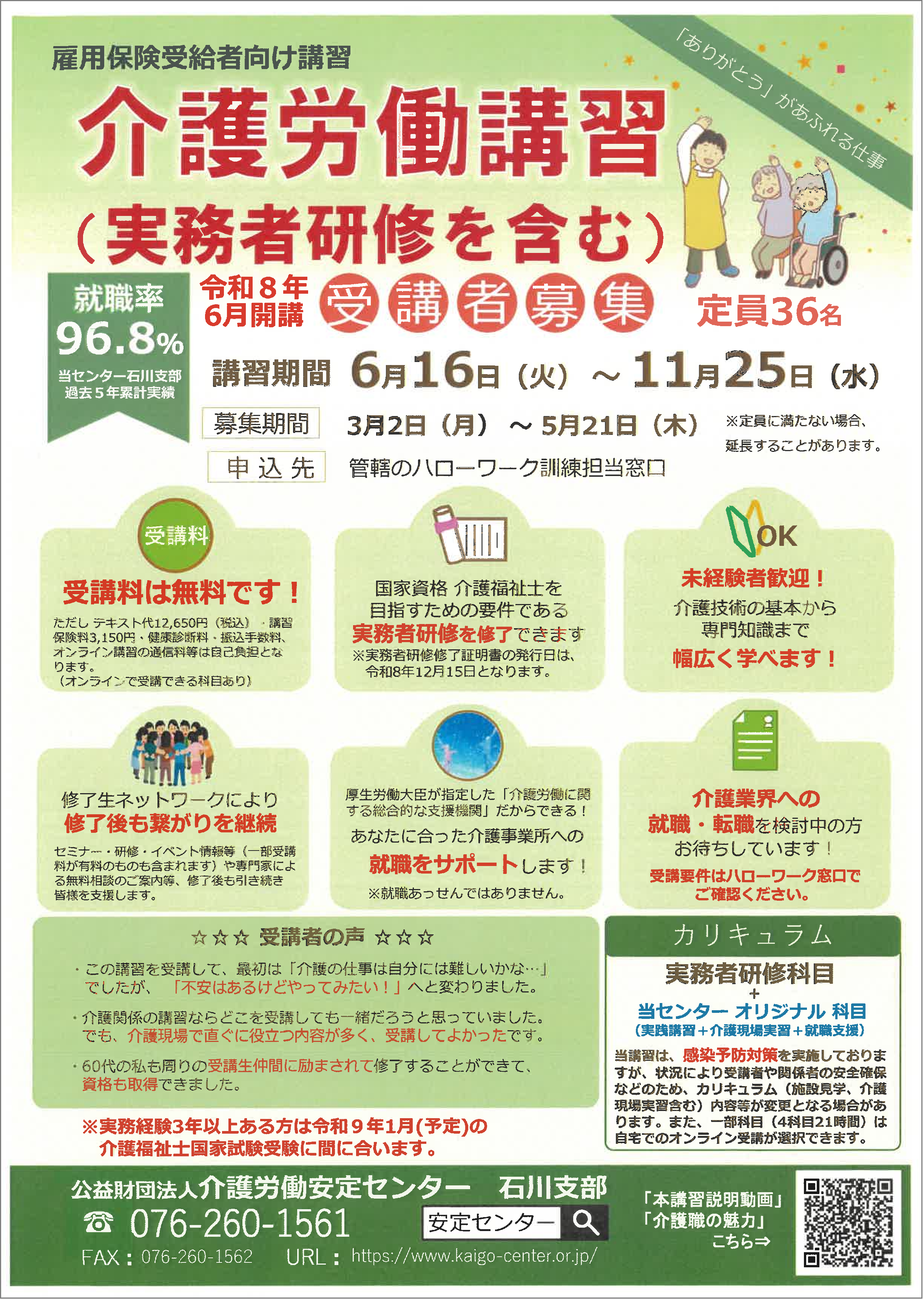 | 「令和8年度 介護労働講習(実務者研修を含む)募集案内について、詳しくは画像 ↓ をクリックしてください。 | ||