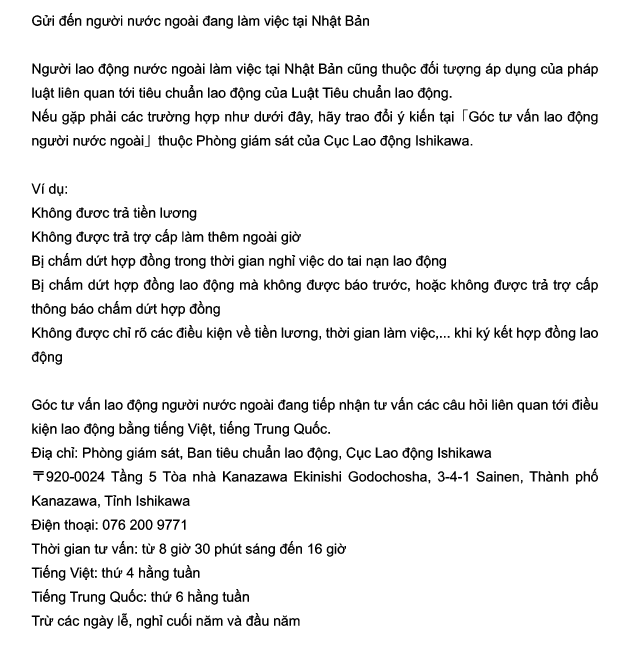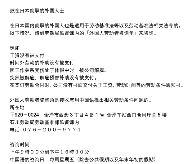 平成31年4月5日に「石川労働局外国人労働者相談コーナー」を新たに開設し、中国語及びベトナム語の2言語による対面及び電話による相談に対応しております。