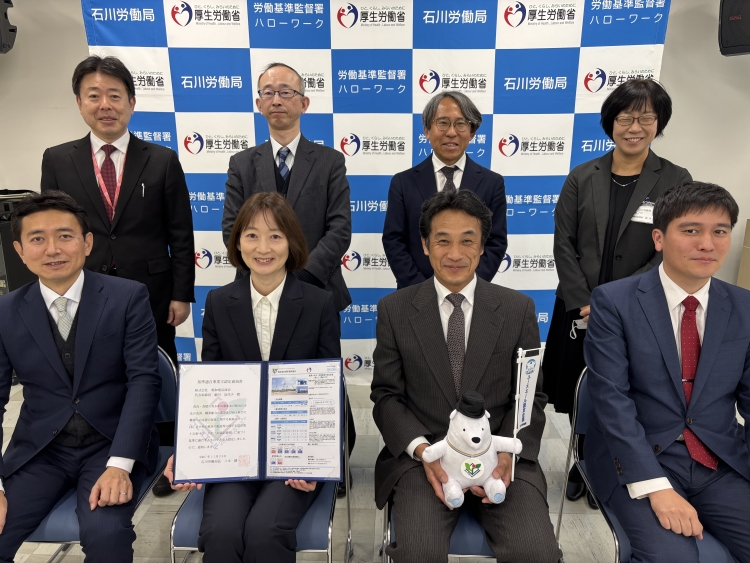 令和8年1月7日(水)にユースエール認定通知書交付式を開催し、石川労働局長 八木 健一(やぎ けんいち)から細川 加代子(ほそかわ かよこ)代表取締役に認定通知書を交付しました。