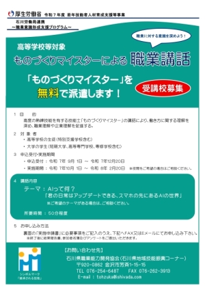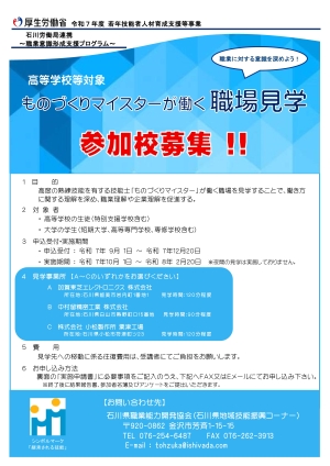 - 【受付12/20(土)まで】受講・参加校募集!「ものづくりマイスターによる職業講話」及び「ものづくりマイスターが働く職場見学」