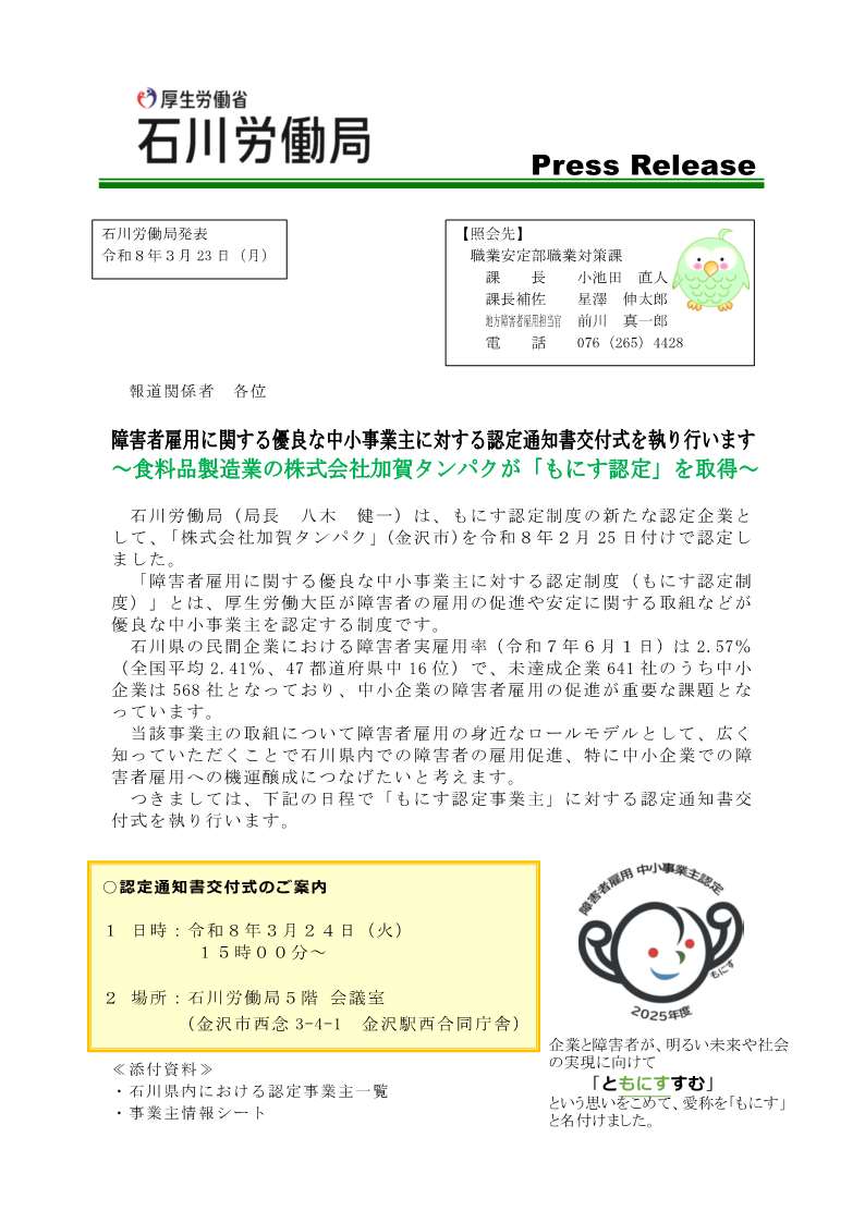 石川労働局(局長 八木 健一)は、もにす認定制度の新たな認定企業として、「株式会社 加賀タンパク」(金沢市)を認定しました。
