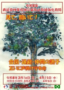 穴水労働基準監督署(署長 春日俊)は、令和8年における奥能登地区の林業での労働災害防止への取り組みとして、本年3月16日~4月15日を「令和8年 奥能登林業労働災害防止取組強化月間」とし、管内の関係団体等及び事業者に対して、同期間中に改めて事業者等による現場パトロールや労働者への指導・教育等を集中的に実施していただくよう協力要請いたしました。(令和8年3月)