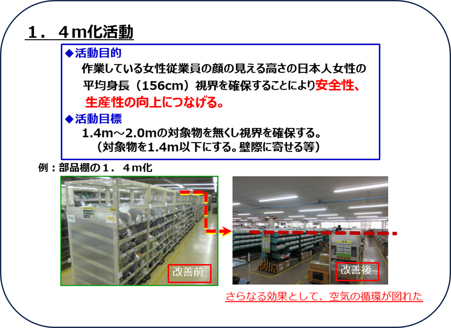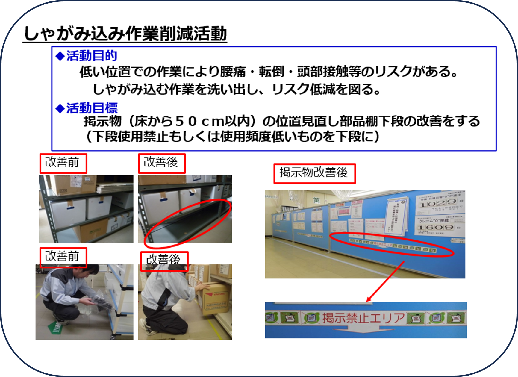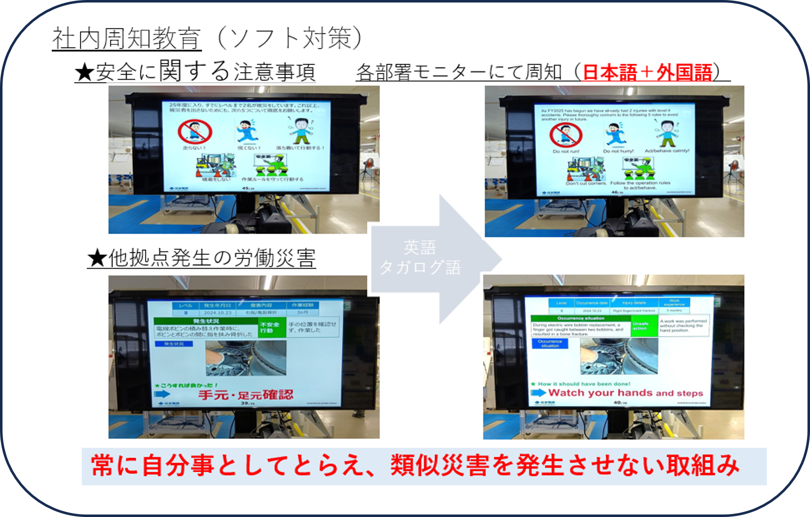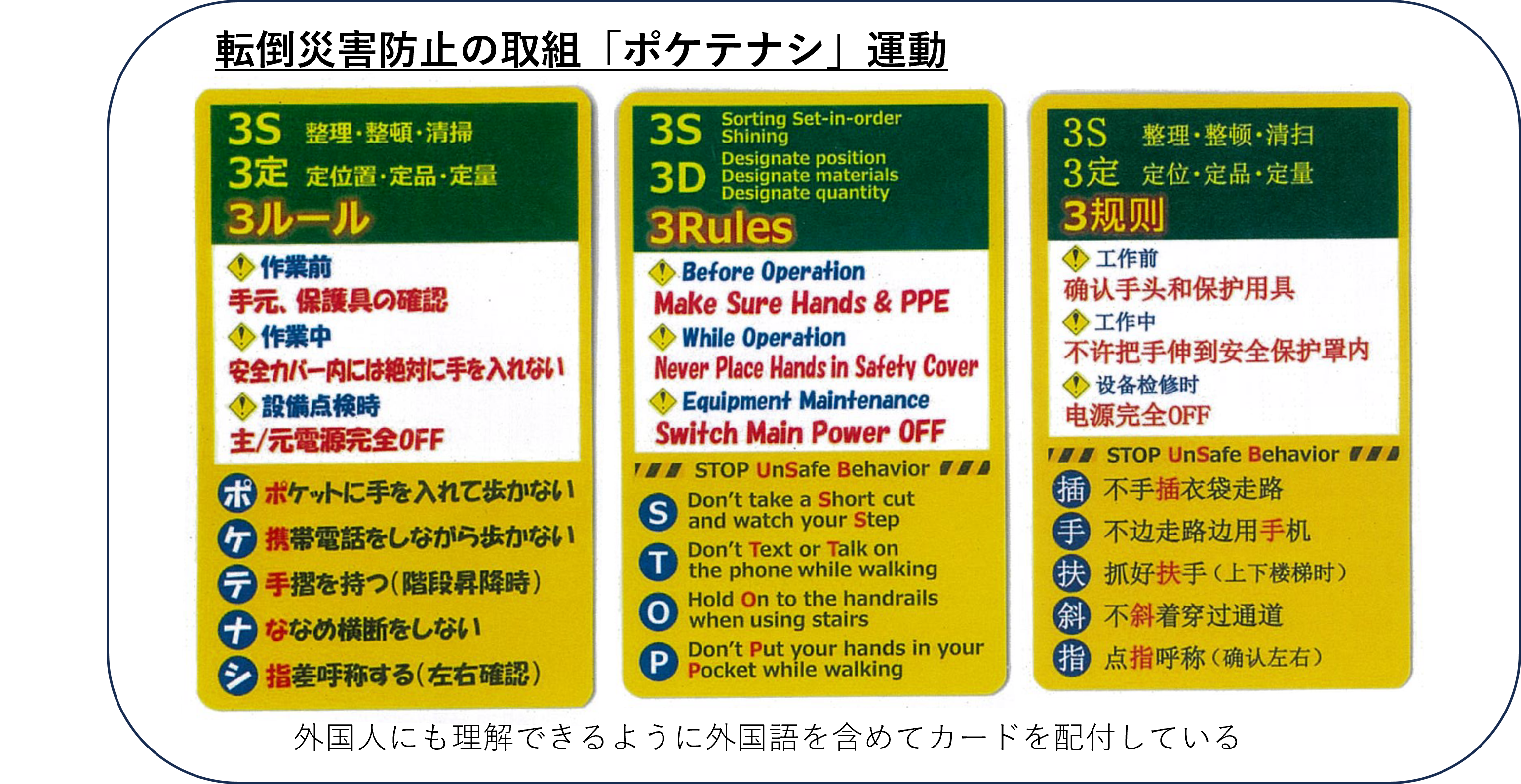 【工場見学により確認された安全衛生対策】 ・ ぶつかり防止センサーの設置(扉の向かい側に人がいるときに点灯) ・ 高所作業時のルール(脚立の使用を禁止し、専用の乗る作業台を使用、ヘルメット着用等) ・ 転倒災害ヒヤリハットマップの作成及び周知 ・ 他の事業場を含めた災害事例、対策の水平展開 ・ モニターを利用した外国語による安全衛生教育 ・ 転倒災害防止の取組「ポケテナシ」運動 ・ 1.4m活動(棚や設備等を1.4m以下にして職場の状況を把握する活動) ・ 55歳以上を対象とした転倒リスクチェック ・ 転倒高リスク者に対するセミナー ・ 地域と連携した取り組み |