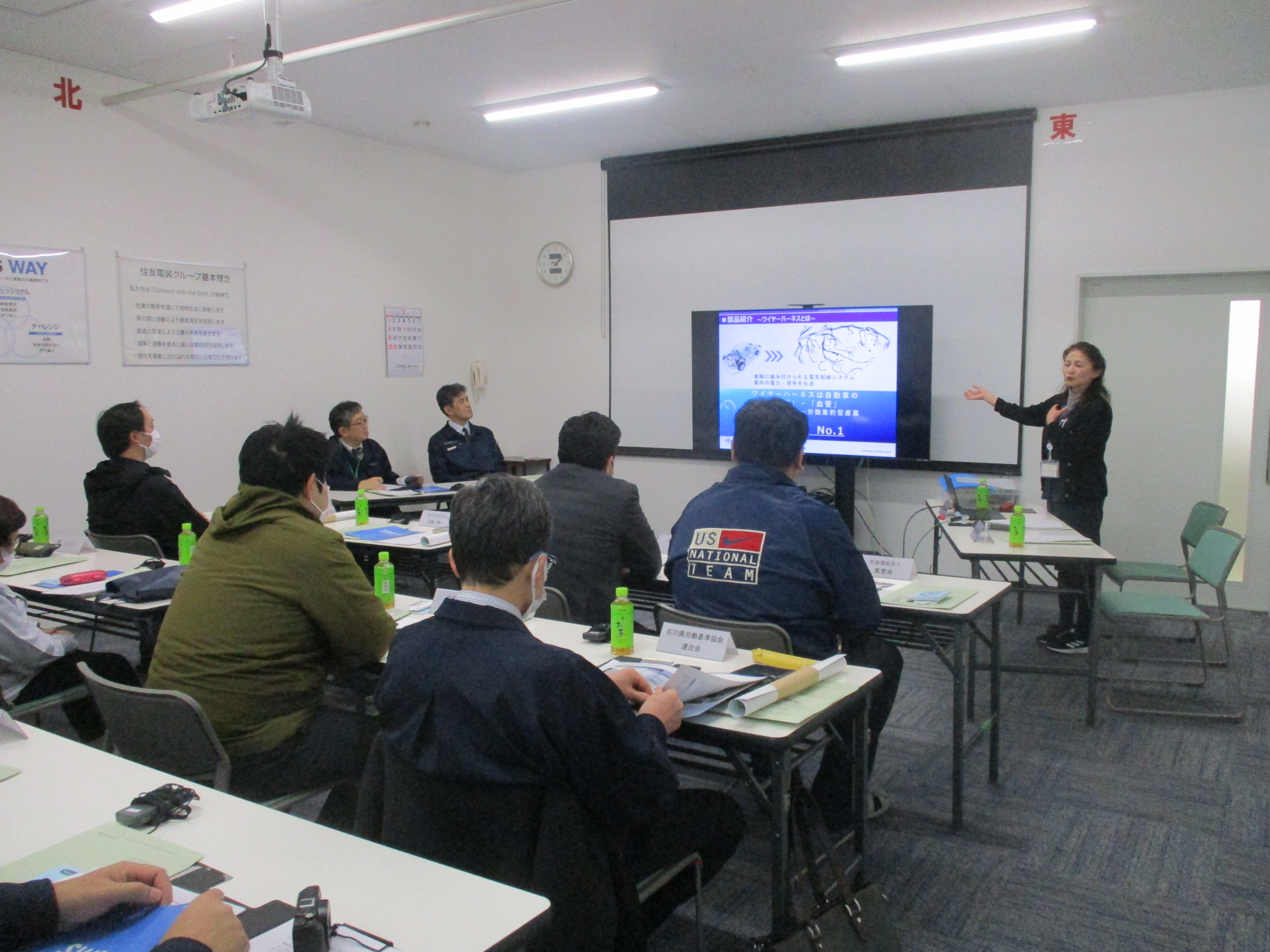 工場見学に先立ち、SWS西日本(株)宇ノ気第2工場での安全衛生活動の紹介を受けているところ