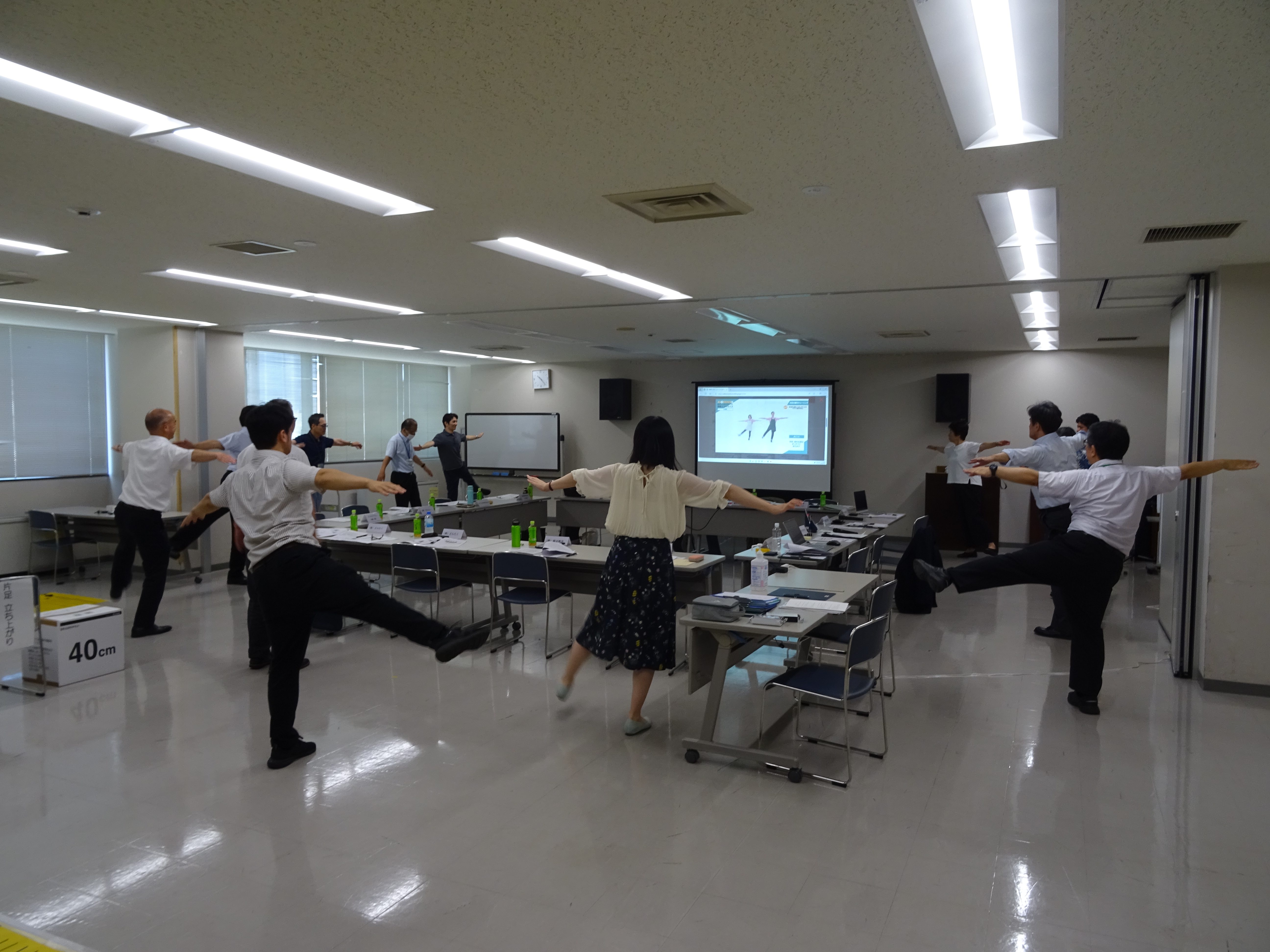厚生労働省SAFEコンソーシアムポータルサイトの職場における転倒・腰痛予防対策動画を視聴し、参加者全員で実践する様子