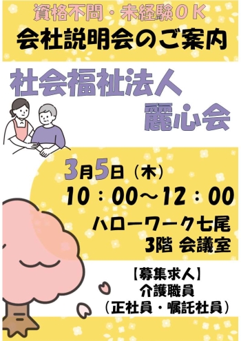 | 3/5(木) | 社会福祉法人麗心会 | 10:00~12:00 |