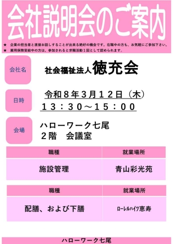 | 3/12(木) | 社会福祉法人徳充会 | 13:30~15:00 |