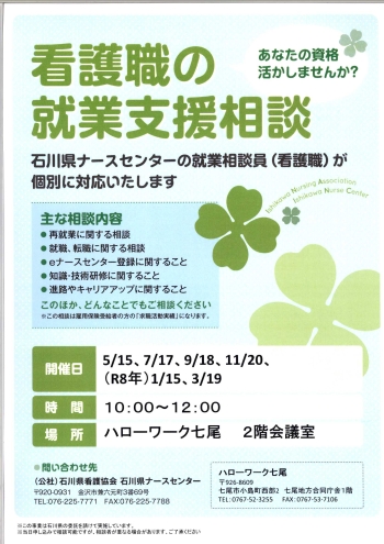 | 3/19(木) | 看護職の職業支援相談 | 10:00~12:00 |