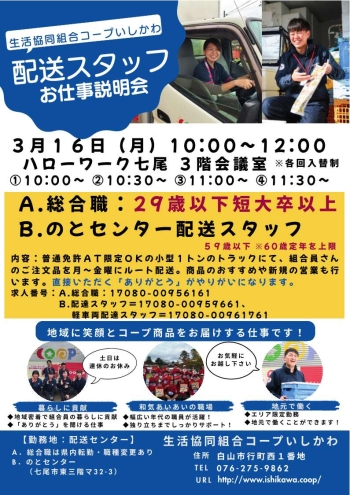 | 3/16(月) | 生活協同組合コープいしかわ | 10:00~11:50 |