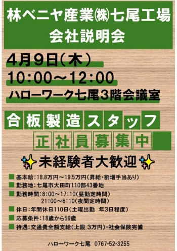 | 4/9(木) | 林ベニヤ産業(株)七尾工場 | 10:00~12:00 |