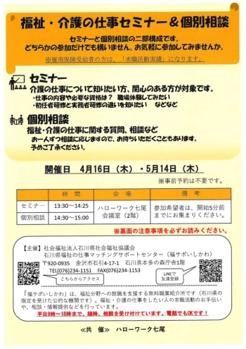| 4/16(木) | 福祉・介護の仕事セミナー&個別相談 | 13:30~15:00 |