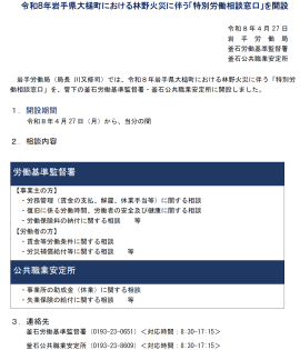 「令和8年岩手県大槌町林野火災」関連情報(岩手労働局からのお知らせ)