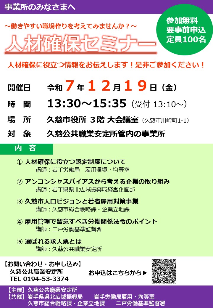 - 【2025.12.19開催】ハローワーク久慈主催「人材確保セミナー」のご案内