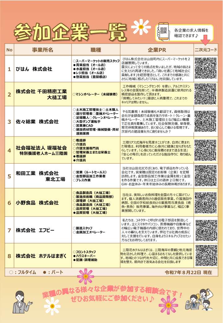 大槌・山田地域で従業員募集をしている企業8社が参加予定。