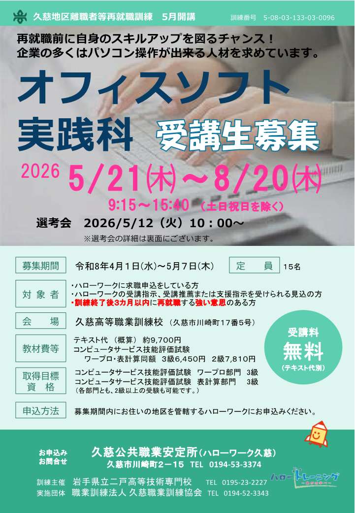 ■【ハロトレ(職業訓練)】オフィスソフト実践科(5月開講・募集締切5/7)のご案内←NEW!!