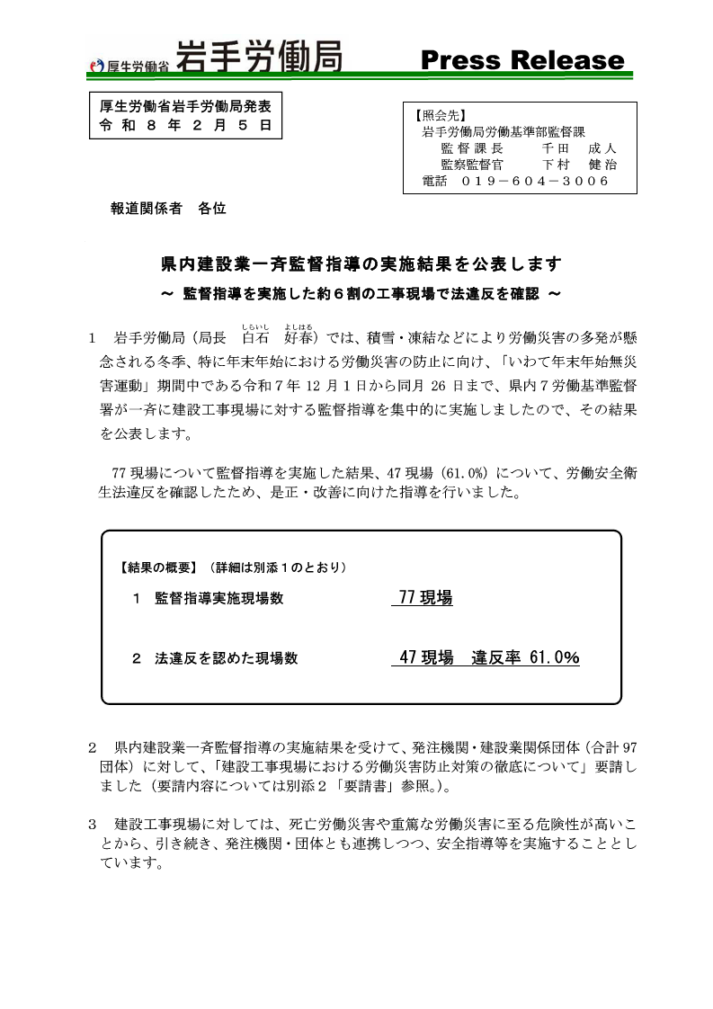 - 令和7年度県内建設業一斉監督指導の実施結果を公表します~ 監督指導を実施した約6割の工事現場で法違反を確認 ~