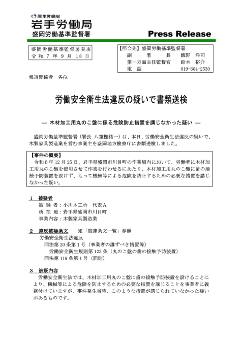 - 労働安全衛生法違反容疑で事件送致~木材加工用丸のこ盤に係る危険防止措置を講じなかった疑い~