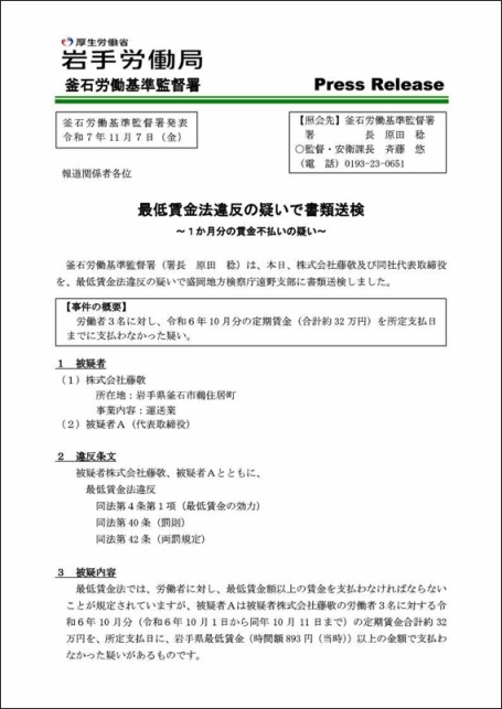 - 最低賃金法違反容疑で事件送致~1か月分の賃金不払いの疑い~