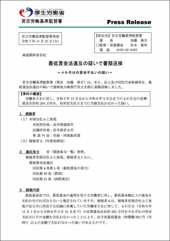 - 最低賃金法違反容疑で事件送致~4か月分の賃金不払いの疑い~