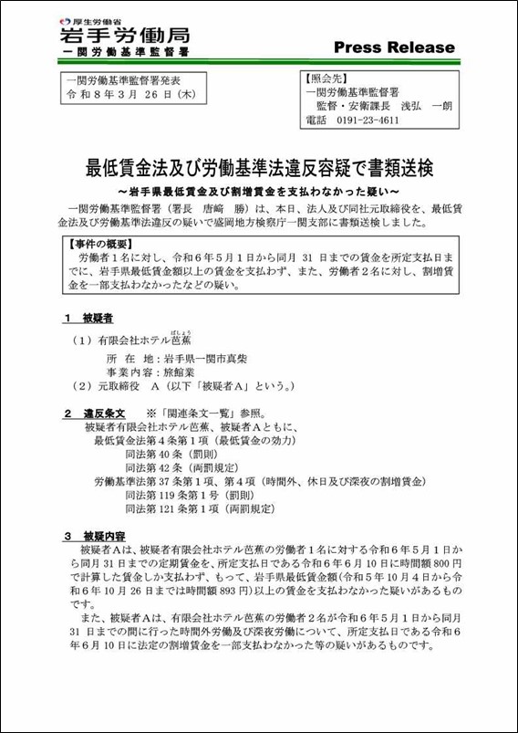 - 最低賃金法及び労働基準法違反容疑で事件送致~岩手県最低賃金及び割増賃金を支払わなかった疑い~