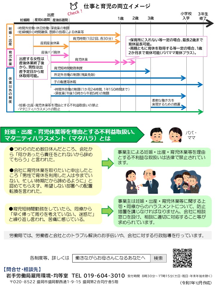 岩手労働局では、働きながらママ・パパになる方へ、仕事と育児の両立に役立つ制度などをまとめたリーフレット「働きながらお母さん・お父さんになる方のために」を作成しました。