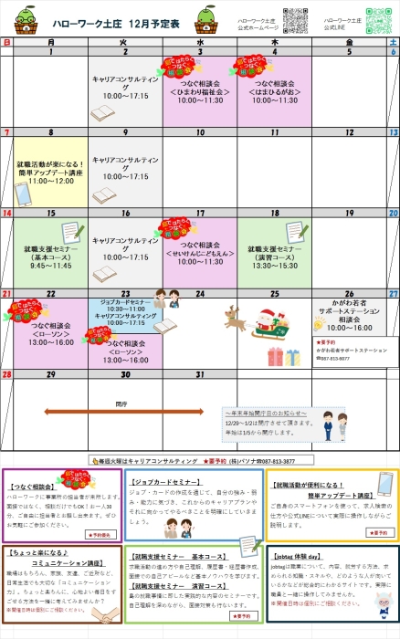 毎週火曜日の1~4の時間枠でキャリアコンサルティングを行っています。ただし、第4火曜日の午前枠は、ジョブ・カードセミナーのため、予約不可です。