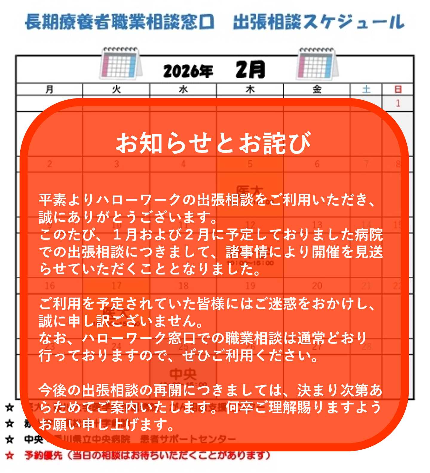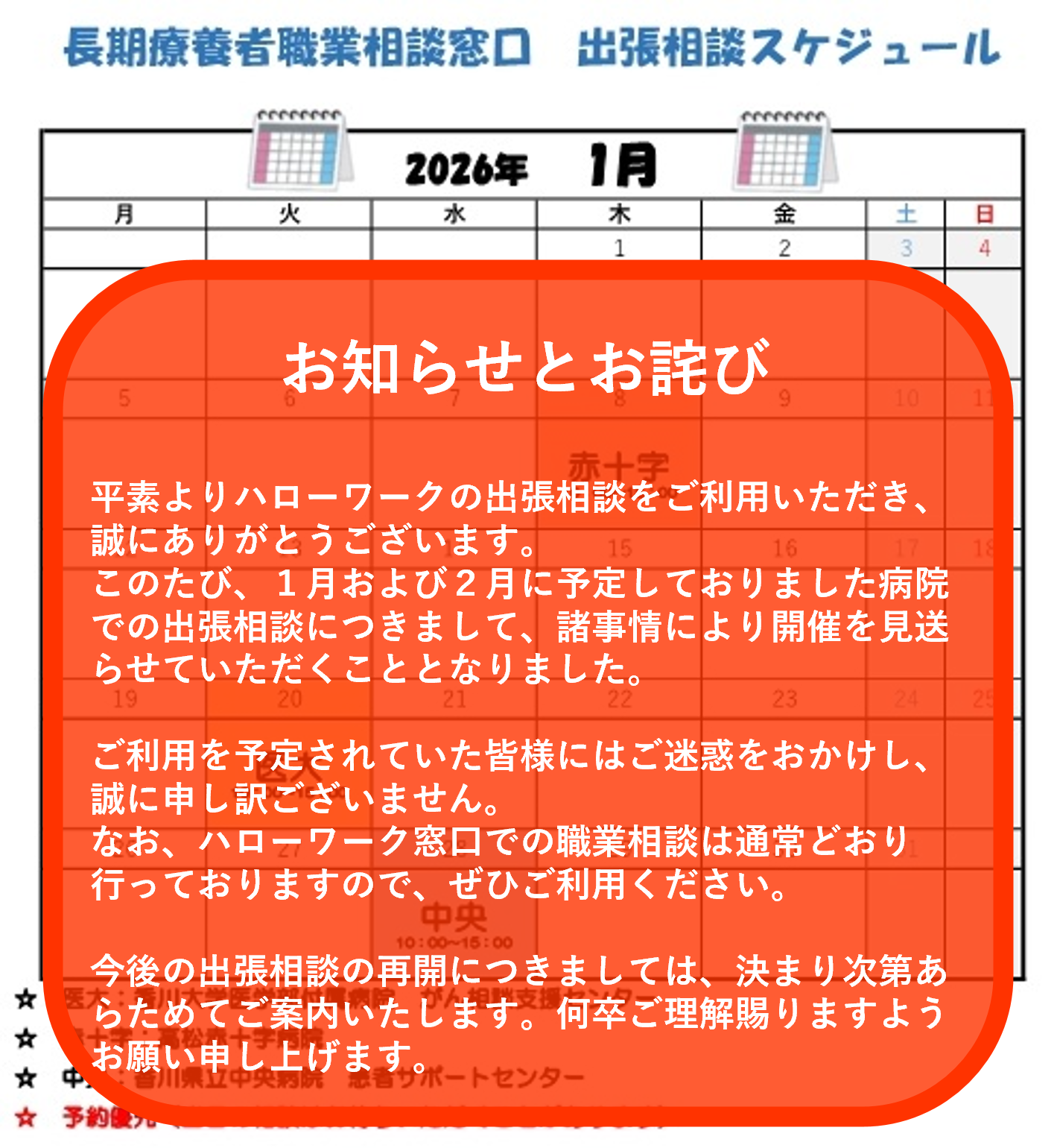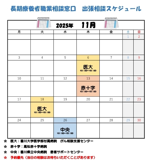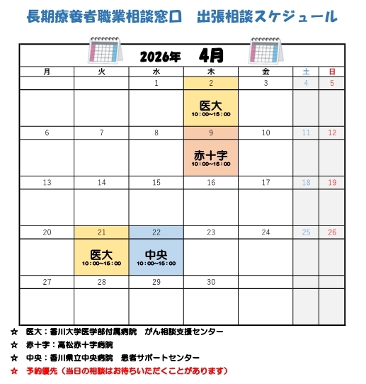 高松市内および三木町内の指定病院において出張相談を実施しています。原則予約制となりますので、ハローワーク高松にご連絡いただくか、各病院にてご予約ください。(予約状況により当日でもご相談頂ける場合もございます。)