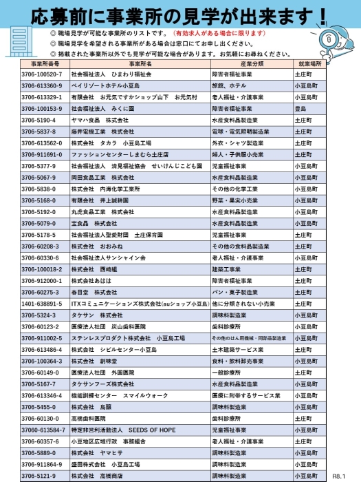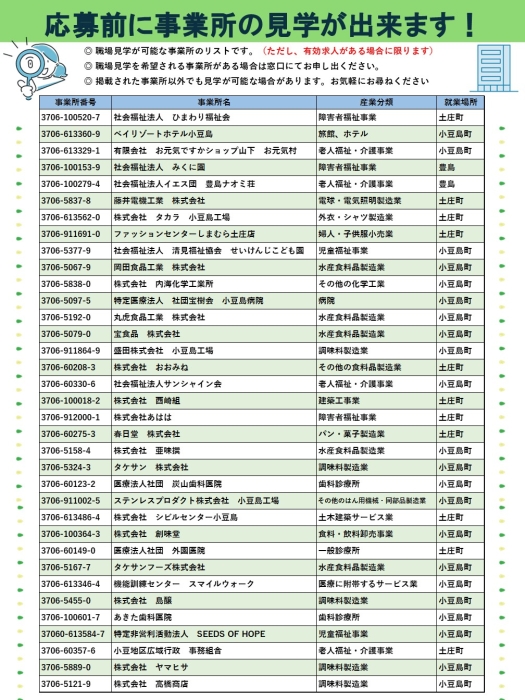 応募前に見学ができる事業所一覧です。