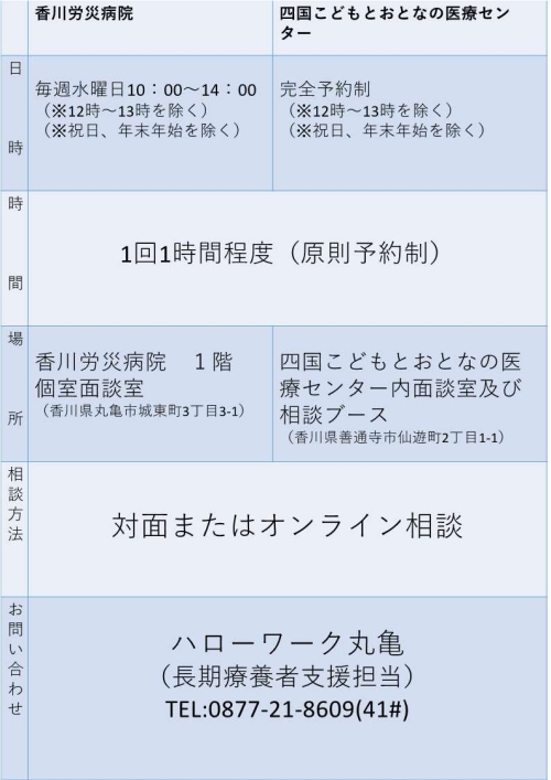 「長期療養者両立求人」などの情報提供を行うとともに、ご本人の体調と希望を考慮しながらより良い職業選択ができるよう支援します。ご希望の方は、ハローワーク丸亀の総合受付にて「長期療養者支援窓口での相談希望」とお申し出ください。