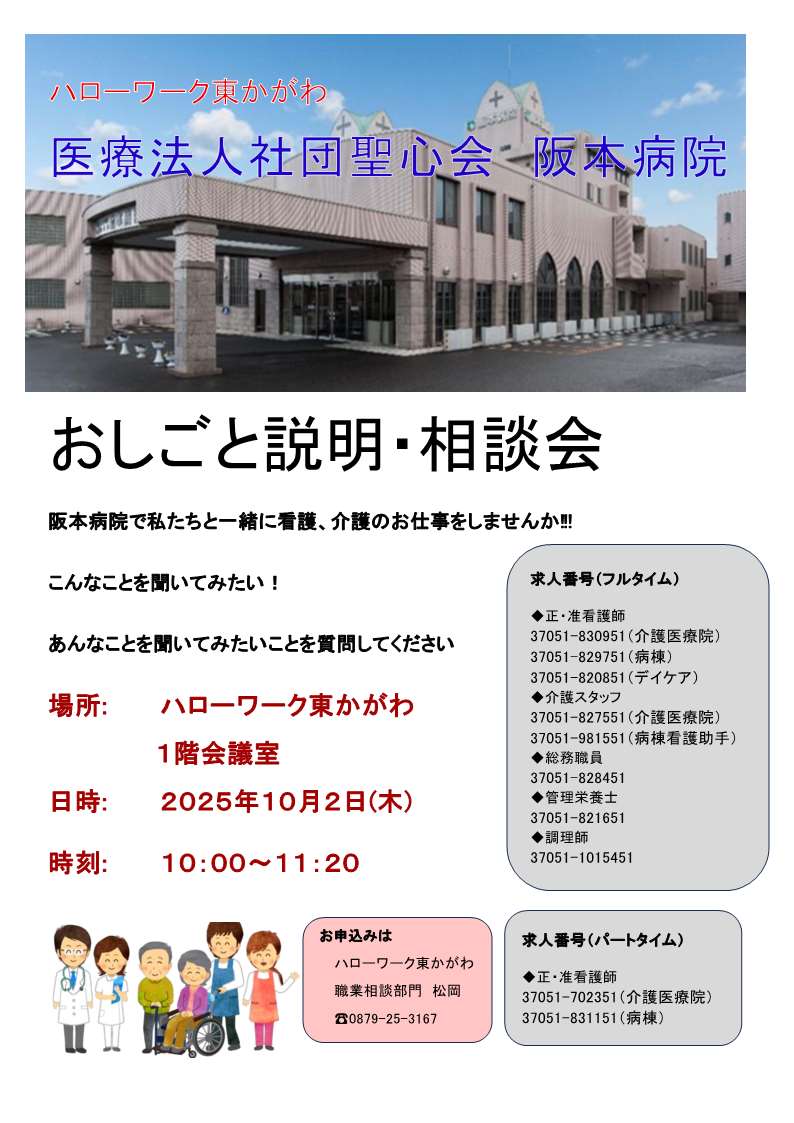 10月2日(木)10:00~11:20 ハローワークさぬき東かがわ出張所1階会議室にて「医療法人社団聖心会 阪本病院 デイリー説明会」を開催いたします。