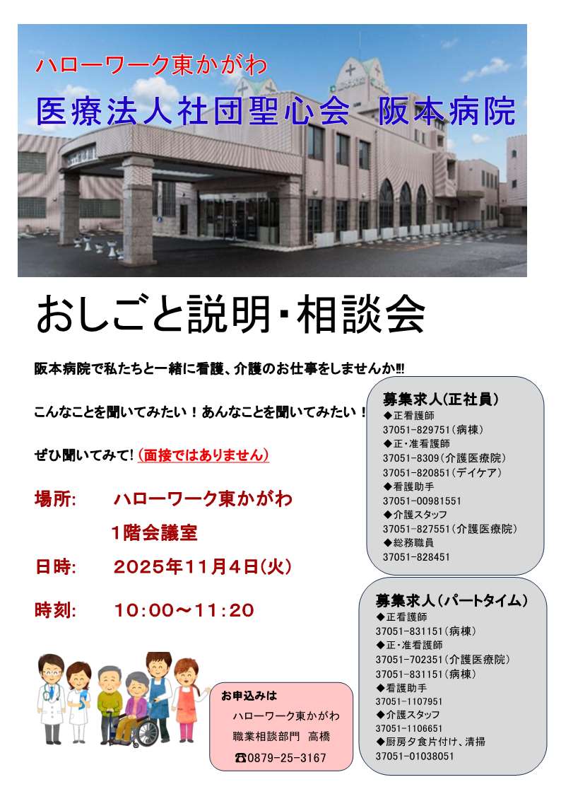 11月4日(火)10:00~11:20 ハローワークさぬき東かがわ出張所1階会議室にて「医療法人社団聖心会 阪本病院 デイリー説明会」を開催いたします。