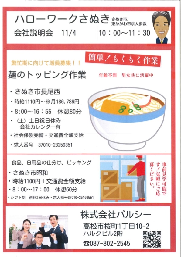 11月4日(火)ハローワークさぬき2階会議室にて「株式会社パルシー デイリー説明会」を開催いたします。
