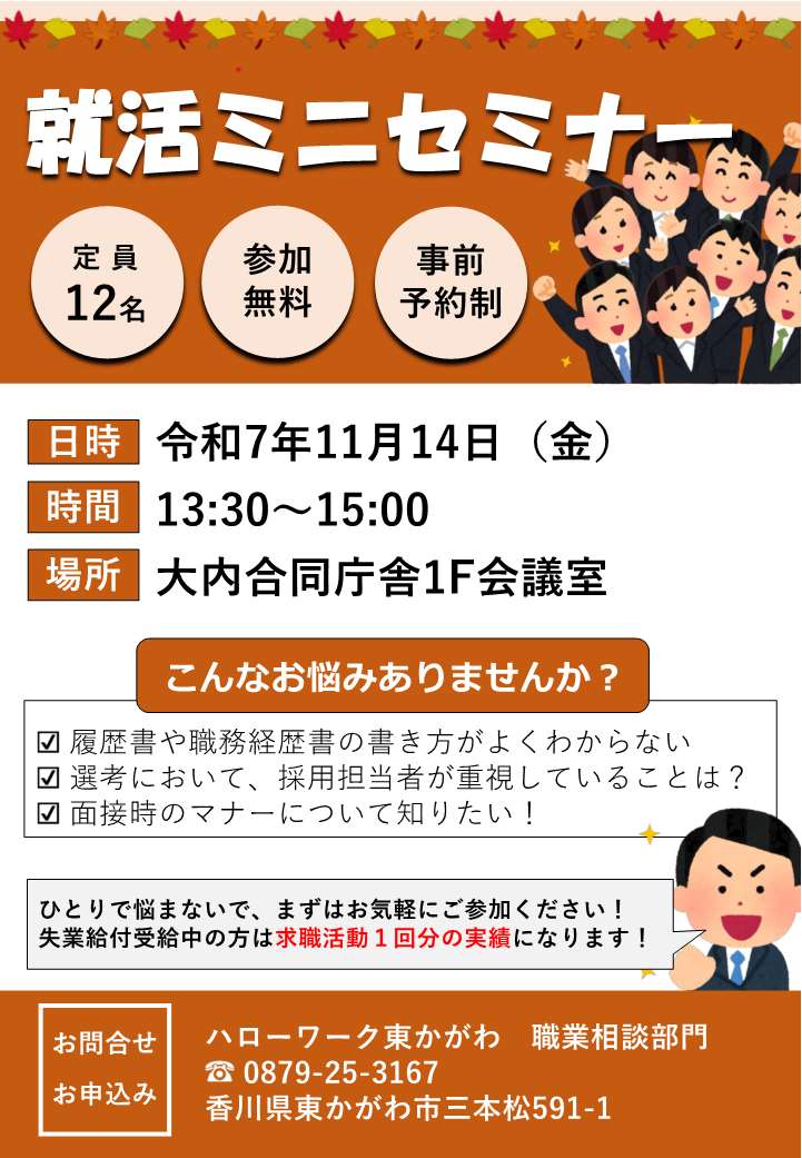11月14日(金)13:30~15:00 ハローワークさぬき東かがわ出張所1階会議室にて「就活ミニセミナー」を開催いたします。応募書類の書き方や面接対策など就職活動のお悩みやポイントについて学ぶことができます。受講された方から大変好評なセミナーとなっております。