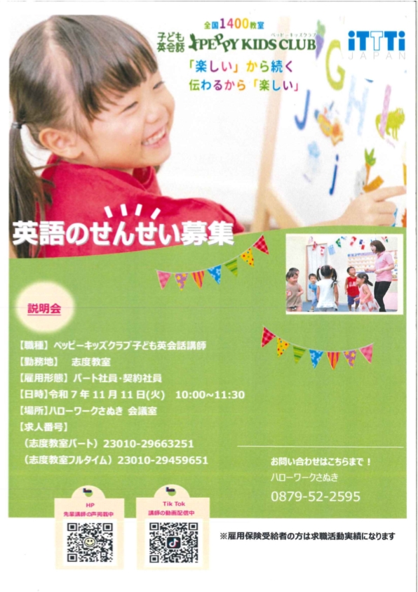 11月11日(火)ハローワークさぬき2階会議室にて「イッティージャパン株式会社 デイリー説明会」を開催いたします。